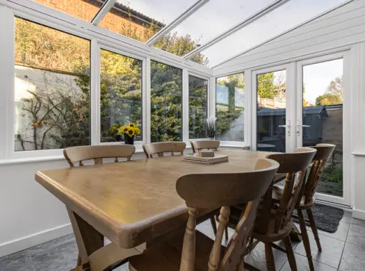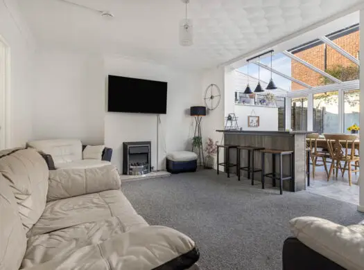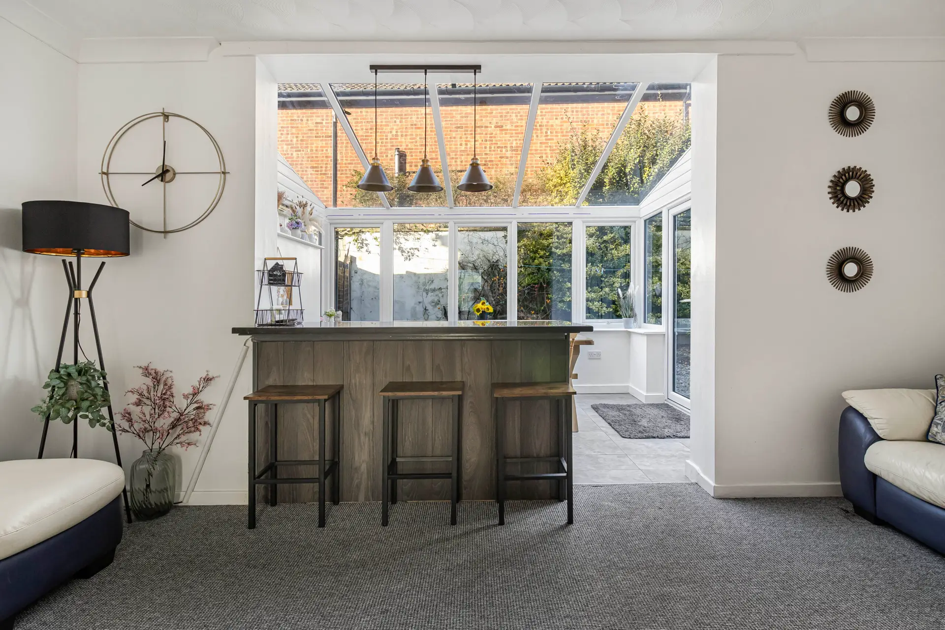 Step inside and the sense of space is immediate. The main living area opens into a conservatory-style extension, creating a large, flowing social space that comfortably accommodates everyday family life as well as larger gatherings. It’s a layout that doesn’t force compromise — practical during the week, generous when entertaining.
